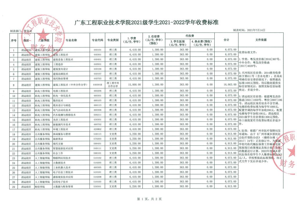 广东工程职业技术学院2021级学生2021-2022学年收费标准