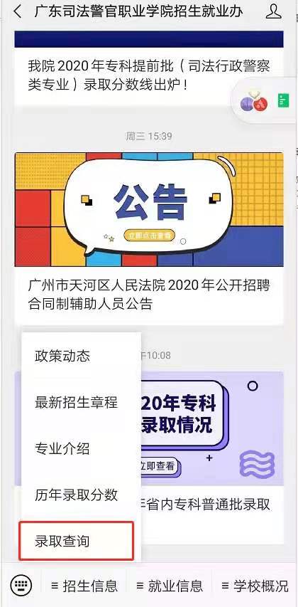 录取情况请考生在公众号对话栏点击“招生信息”—“录取查询”—登录我院官网招生信息网(http://www.gdsfjy.cn:9001/zsxt-web/index.do)查询,进入“录取查询”模块后输入考生姓名、身份证号、考生号相关信息即可查询拟录取情况。(操作示意图见文末)最终录取结果以省教育考试院审核通过的录取名册和我院寄发的录取通知书为准。(录取通知书将于8月份寄出)