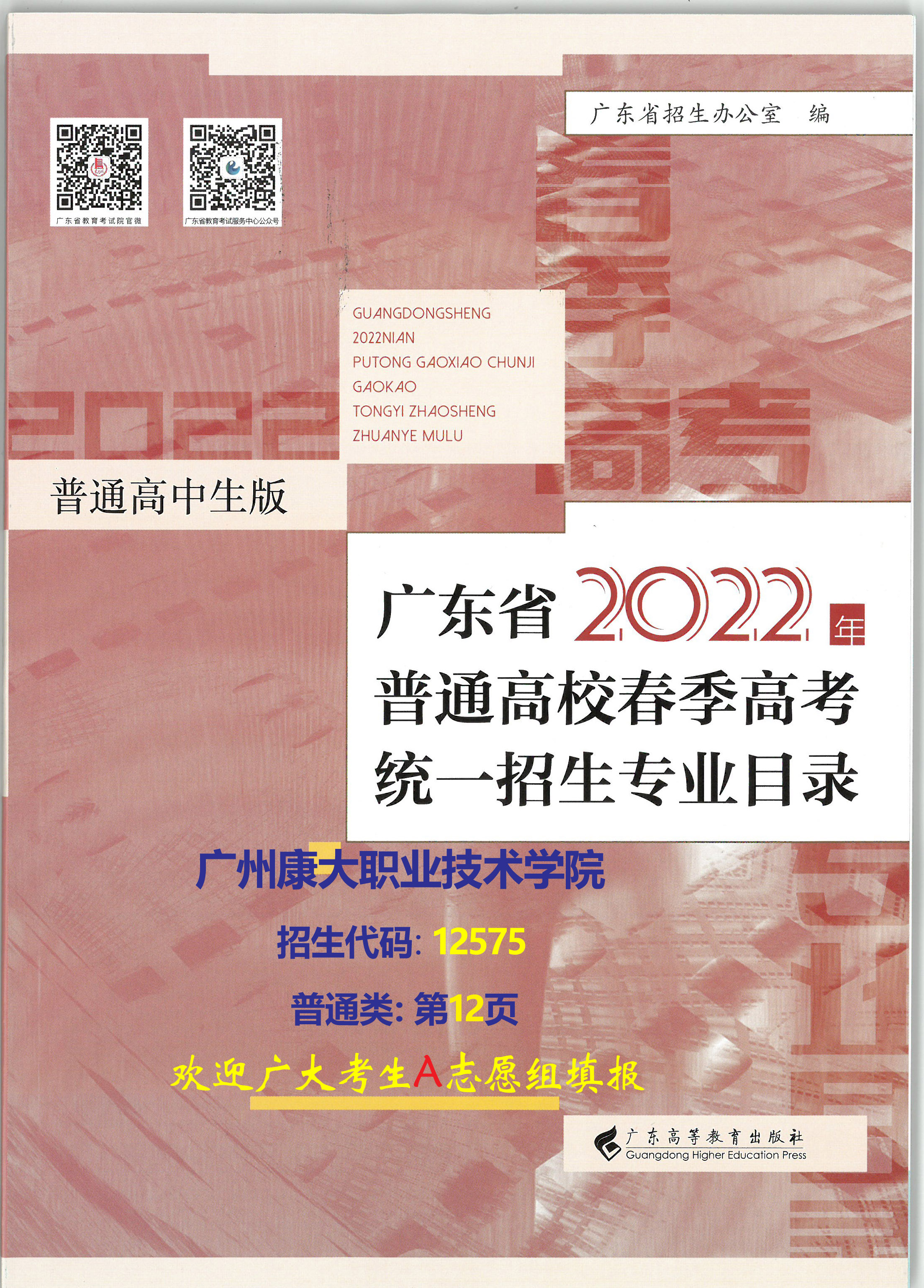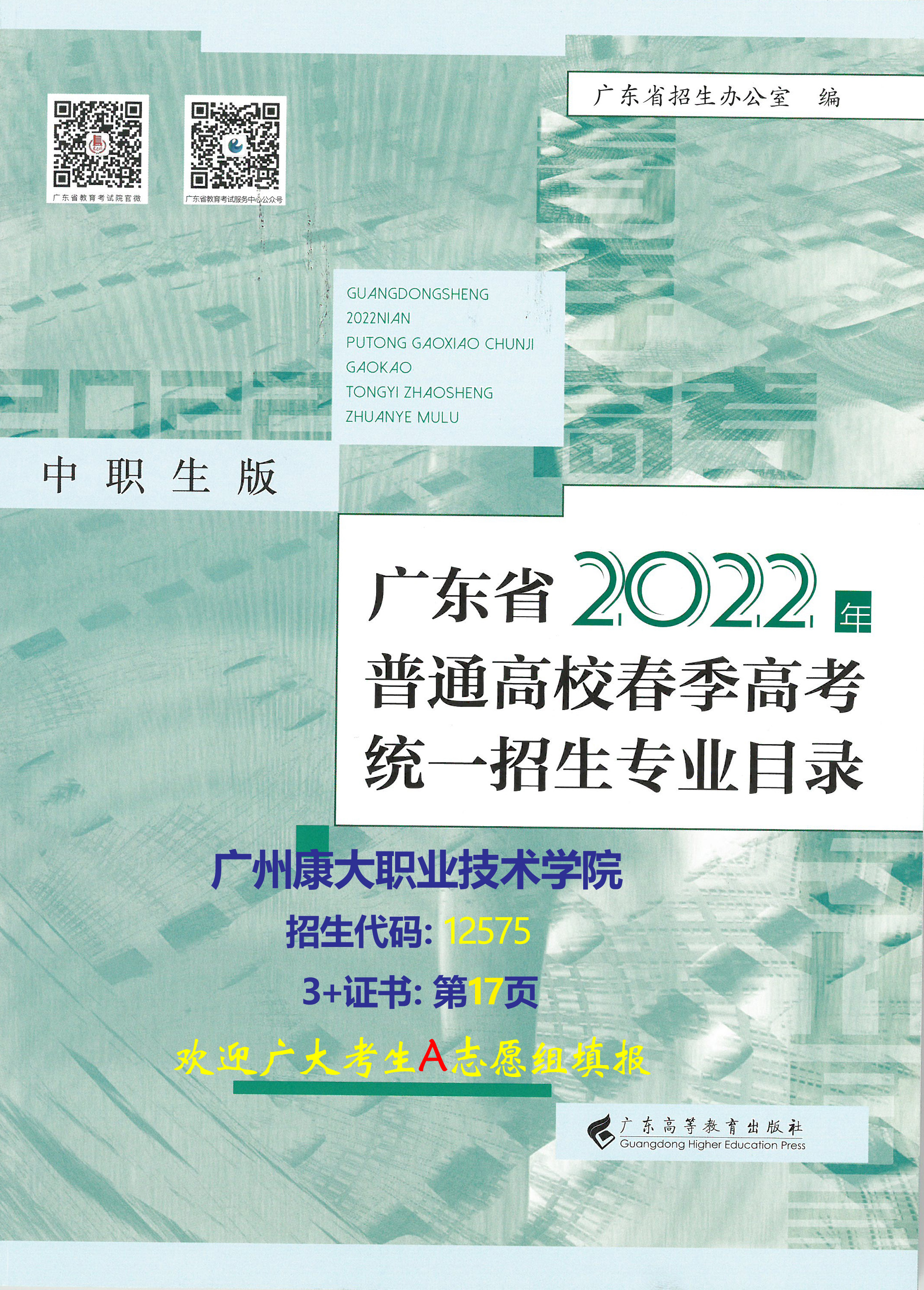 2022年广州康大职业技术学院(院校代码:12575)在广东省春季普通高考招生计划为1176人,其中普通类招生616人、高职类3+证书招生560人。有关各专业的专业代码和招生计划请仔细查看下图。普通高中生版中职生版