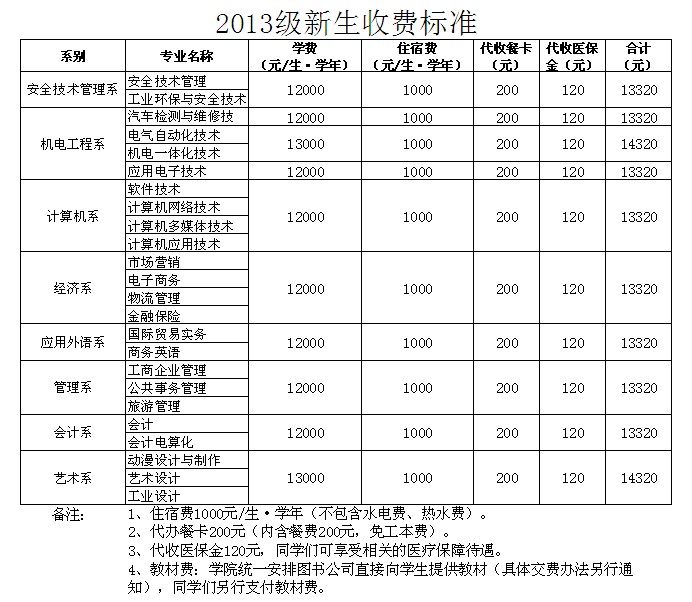 为使您能顺利到达学院报到,请认真阅读以下“新生入学须知”,并按要求办理入学手续: 一、新生报到注册时间:2013年9月15日 报到地点: A栋教学楼 二、凭《录取通知书》到当地市、县招生办公室或毕业的中学(以当地招生部门的通知为准)领取“考生档案”,并自带纸质档案和党团组织关系来学院报到(请勿邮寄)。档案应保持清洁无损,并处于密封状态。 三、凭《录取通知书》按规定时间(不要提前也不要推迟)准时到学院报到。如不能按时报到,须向学院招生办请假,电话:020-82872088、32971192,请假时间不得超过一周,未经请假或请假逾期不到者,视为自动放弃入学资格。 四、按上级主管部门规定,新生入学可不迁户口,但需持《录取通知书》到户口所在地派出所登记盖章,没有派出所印章,不予办理入学手续。 五、如需迁户口到我院的,请参照《新生入学指南》迁移户口须知执行。 六、按广东省人民政府征兵办公室和广东省教育厅有关通知,从2012年起,在新生入学后要查验广东省籍18至24周岁适龄男性公民的《广东省公民兵役证》。请相关新生到户籍所在地的兵役机关进行兵役登记,入学时需持有《广东省公民兵役证》原件,以便查验。 七、报到时带彩色小一寸正面免冠照片10张,以便办理各种证件。 八、新生需自带或自购床上用品,日常生活用品。学院商场备有成套床上用品和生活用品,供学生选购。 九、学院位于广州市萝岗区九龙镇(中新广州知识城),广汕公路转九龙大道方向3公里处。报到当天,学院在广州火车站、天河客运站、九龙路口处设有新生接待站(省汽车站、广州市汽车站、流花汽车站有工作人员指引新生到接待点),有专车接新生入校。可自行乘广州市客运站、东圃客运站、罗冲围客运站往返增城的车到九龙路口我院新生接待处转入我院。也可乘坐345路公交车(天河客运站总站←→九龙镇政府总站)到康大职业技术学院站下车。 十、我院收费和缴费方式: 缴费方式: 1.存折划扣 为方便您缴交学费,降低携带现金的风险,我院委托广州银行开发区支行通过银行划扣方式进行收取,请于2013年8月22日-9月2日前将学杂费(含学费、住宿费、代收医保金、餐卡)存入随录取通知书所附的银行卡中(建议多存入15元因账户余额不能为0),该帐户的具体使用方式详见银行卡附件的相关说明。如对收到的银行卡和存款方式有疑问可与广州银行开发区支行联系,直接受理网点电话:020-82219958、82214832客服热线:020-96699,网站:www.gzcb.com.cn。 温馨提示: 1)如外地银行未联网可以到任意银行用电汇方式汇到我院代开的学生本人银行卡上。 2)电汇时请填写,收款人:学生本人姓名;开户行:广州银行开发区支行;账号:广州银行卡账号。 (汇入行行号:313581003194) 3)请保管好相关银行单据,以备入学时查询。 2.现金缴费 如电汇确有困难的同学入学报到时可交现金。 学院财务咨询电话:020-32972288 传真:020-82870987 (备注:医保金受医保局委托,同学费一起统一代收,金额为120.00元)