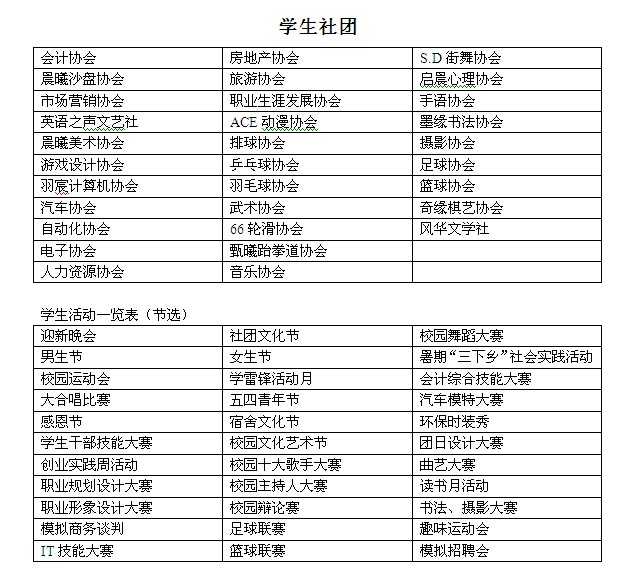 团委简介 学院团委是我院先进青年的群众组织,始终坚持以邓小平理论和“三个代表”重要思想为指导,以科学发展观为指引,坚持党建带团建,通过“目标管理、制度管理、情感管理”实现团的“组织建设、思想引领、服务成长”。 团委架构: 书记处 办公室 组织部 宣传部 团务部 实践部 社团部 广播台 大学生艺术团 青年志愿者服务总队 学生会简介 学院学生会是学院团委具体指导下的全校学生的群众性组织。学院学生会以“自我教育、自我管理、自我服务”为工作宗旨,以“学子之家、师生之桥、干部之校”为定位,多角度全方位组织开展健康有益、丰富多彩的学习、科技、文体、社会实践、志愿服务、民主管理等多种活动,促进学生在德、智、体、美等方面全面发展。 学生会架构: 主席团 办公室 宣传部 学习部 辩论队 文娱部 女生部 体育部 裁判组 信息技术部 外联部 生活部 楼管会 学生自我服务中心 学院广播台 学院广播台以“引导人、塑造人、鼓舞人”为宗旨,把握正确舆论导向,构筑思想教育平台;以“至真、至新、至善”为台训,以“你有才华,我有空间;有我空间,你更精彩”为口号,活跃校园文化生活,凝练校园文化品牌。 学院广播台架构: 台长团 秘书部 采编部 播音部 宣传部 外联部 技术部 学院大学生艺术团 学院大学生艺术团是由艺术特长和热爱艺术的学生共同组成的群众性艺术团体。本着“丰富校园文化生活,提高学生艺术修养”的宗旨,为广大师生提供了“展康大风采、现个人魅力”的大舞台。曾多次承办迎新晚会,受邀参加企事业单位各种大型晚会演出,在广东省大学生校园文化艺术节比赛中多次获奖。 学院大学生艺术团架构: 秘书处 主持人队 歌唱队 舞蹈队 曲艺队 模特队 礼仪队 青年志愿者服务总队 青年志愿者服务总队是由志愿从事社会公益活动的我院青年组成的全校性学生团体组织,是由学院团委直接进行管理和业务指导的大学生志愿者团体。以“奉献、友爱、互助、进步”为宗旨,传播“我志愿,我奉献,我快乐”的志愿精神。 志愿者服务总队架构: 秘书处 策划实践部 公关外联部 宣传演绎部 招募培训部 信息技术部 社团 活跃的社团活动是校园文化中靓丽的一景,学生社团有专业技能型社团和兴趣爱好型社团。在学校里,你可以做一些自己想做的事,加入社团就是比较明智的选择,满足自己爱好,还可以交志同道合的朋友。