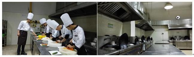 该专业共有七大实训室,实训面积约1000多㎡,已投入约100万元,借助成功申请的佛山市粤菜师傅培训基地,计划再投入120万用于改建实训基地。目前配备中西餐实训室、中西点实训室、基本功实训室等,可以同时容纳100人实践教学,满足学生烹饪原材料加工、菜点切配、营养配膳、加热熟制、营养分析、创新菜点制作等实训操作要求,能培养更多符合餐饮、食品、服务产业需要的高技术技能型人才。