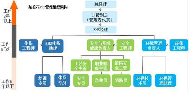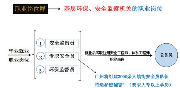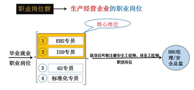 本专业毕业生就业岗位主要是面向生产(管理)一线的企业环境健康与安全部、环境健康与安全技术咨询中介公司、基层环境保护行政监察部门、基层安全检查部门等领域,从事企业EHS管理、ISO体系(ISO14000&ISO45001&ISO9001)运行、EHS认证咨询技术服务、环境监察、安全检查工作的高级技术技能型人才。企业的职业生涯发展过程可见图1,职业岗位群可见图2-图4: