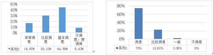 本专业毕业生就业情况好,人才培养质量得到毕业生和用人单位的认可。目前本专业已有六届毕业生,主要从事于企业安全健康与环保专员、安全管理员岗位。截至2019年6月30日,2018届毕业生就业率达到100%,专业对口率88.8%,平均薪酬3881元/月,各方面情况明显高于学院其他专业的同期平均水平。用人单位对本专业2019届毕业生总体评价中,认为“满意”的占75%,“比较满意”的占22.92%,认为“一般”的占2.08%,“较不满意”和“非常不满意”的均为0,具体见图5和图6。