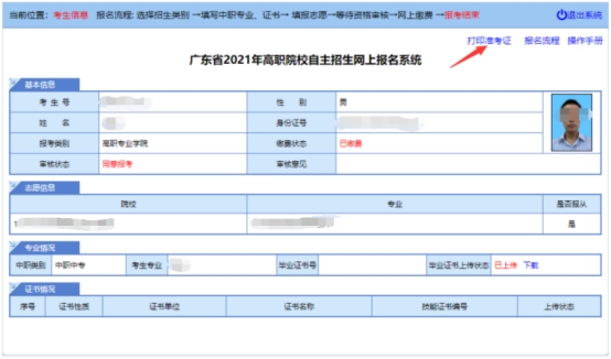 一、准考证打印时间:2021年5月10日起开始打印,打印网址:https://www.eeagd.edu.cn/gzks/,输入报名时的考生号、密码登录,点击“打印准考证”,具体如下图所示: