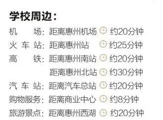 以学校为中心,辐射周边交通,出行快捷便利,方向四通八达。惠州地处交通重要枢纽,飞机、高铁、城际轨道拉近了家校的距离。