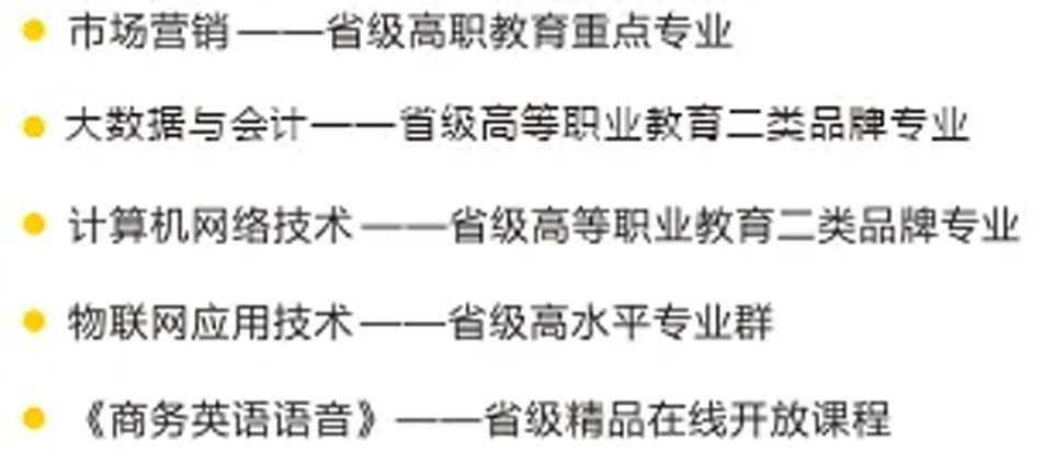 学院建设有广东省高水平物联网技术专业群:计算机网络技术(广东省品牌建设专业)、物联网应用技术、软件技术、计算机应用技术、电子信息工程技术等5个专业;校级智能电商专业群:电子商务、大数据技术、人工智能技术应用、跨境电子商务等4个专业。