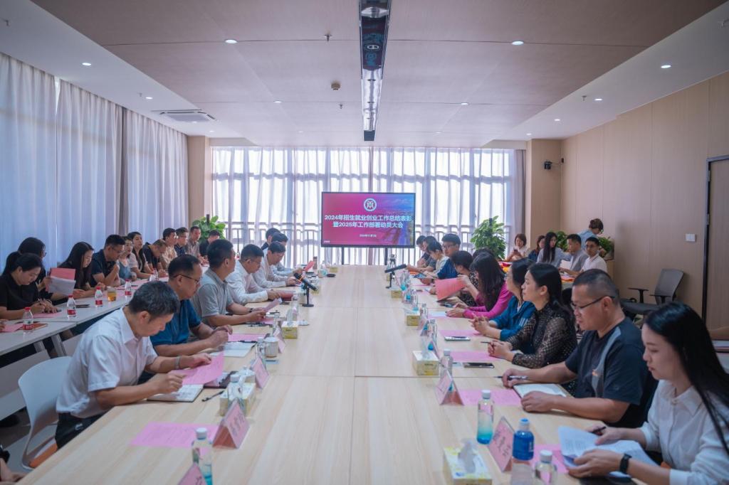 余家军作总结讲话。他表示,2024年我校招生、报到人数创历史新高,江门校区在校生规模突破万人,成为全省民办高职院校中的佼佼者。这一成绩的取得,得益于精准的招生策略和全体招生人员的不懈努力。他要求,要通过校院两级协同合作,线上线下联动宣传,让更多的学生和家长了解了学校的优势和特色。同时,也积极应对了不同校区的招生挑战,合理规划了招生计划,为学校的整体发展奠定了坚实的基础。余家军指出,要清醒地认识到,未来的工作仍然面临着诸多挑战。随着社会的发展和教育改革的不断深入,我们需要不断创新和改进我们的工作方法,以适应新的形势和要求。她要求,要进一步完善招生、培养、就业一体化的人才培养链条。加强专业建设,优化专业布局,根据市场需求和学校实际情况,合理设置专业和招生计划。充分发挥两校区的优势,打造特色专业,通过两校区的差异化专业布局,实现资源的合理配置和优势互补。他还表示,要创新宣传方式和手段,提高学校的知名度和美誉度。不仅要宣传学校的硬件设施和师资力量,更要宣传学校的教育理念、教学质量和学生的发展前景。