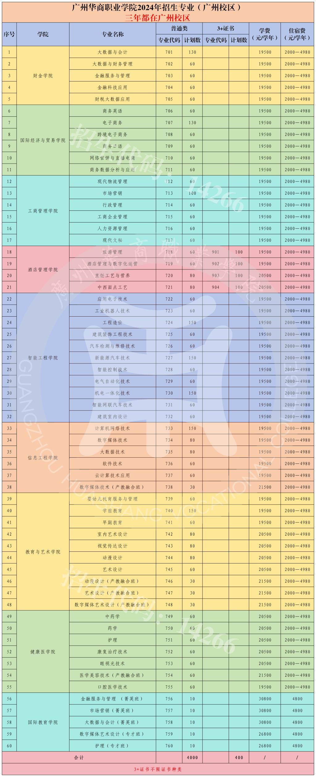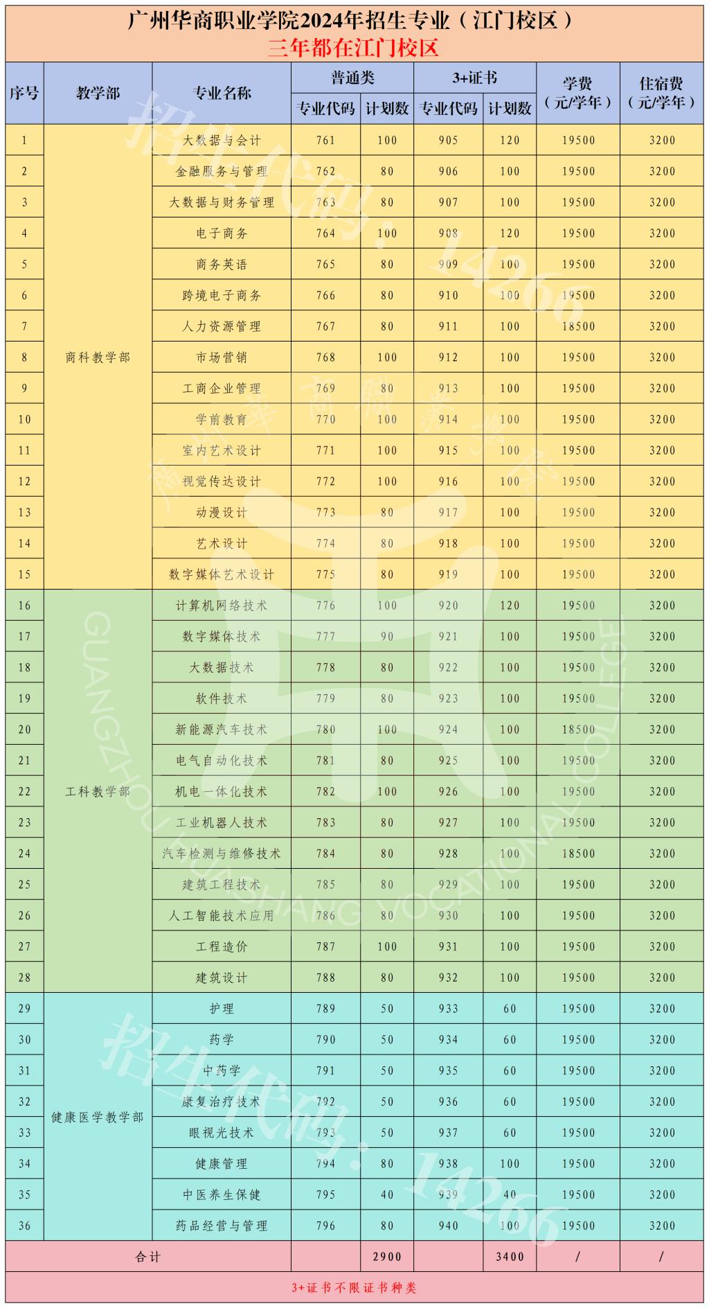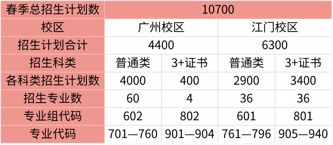2024年我校两校区同时面向依学考(普通类)和3+证书招生,共10700个招生计划。广州校区共60个招生专业,依学考(普通类)4000个计划,3+证书400个计划江门校区共36个招生专业,依学考(普通类)2900个计划,3+证书3400个计划