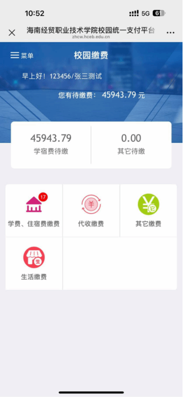 一、关注公众号“海南经贸职业技术学院”,微信校园-“学费缴纳”进行登陆。