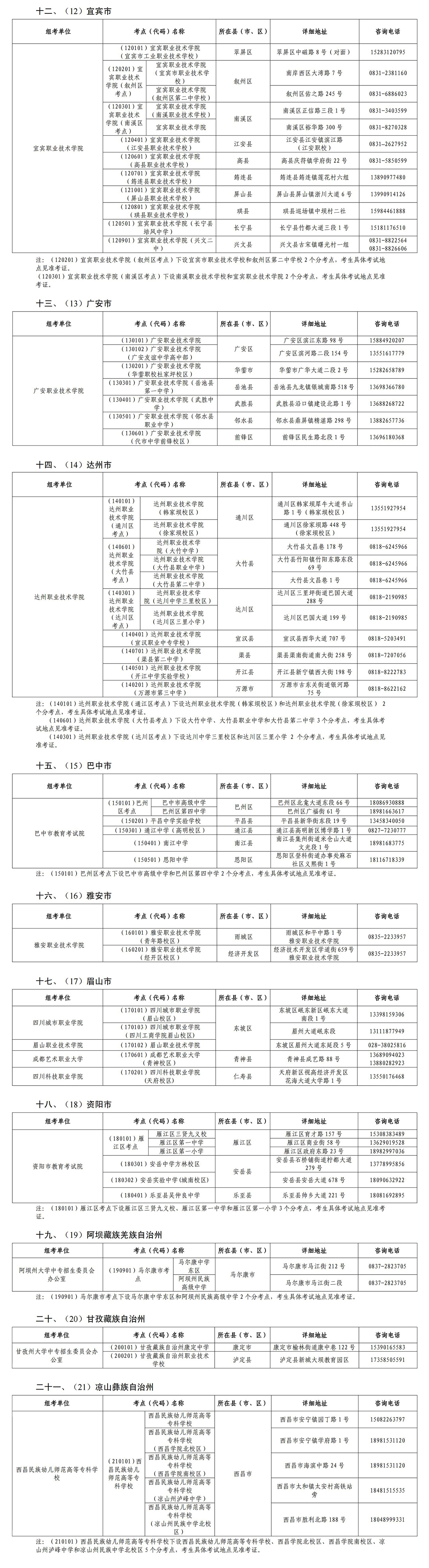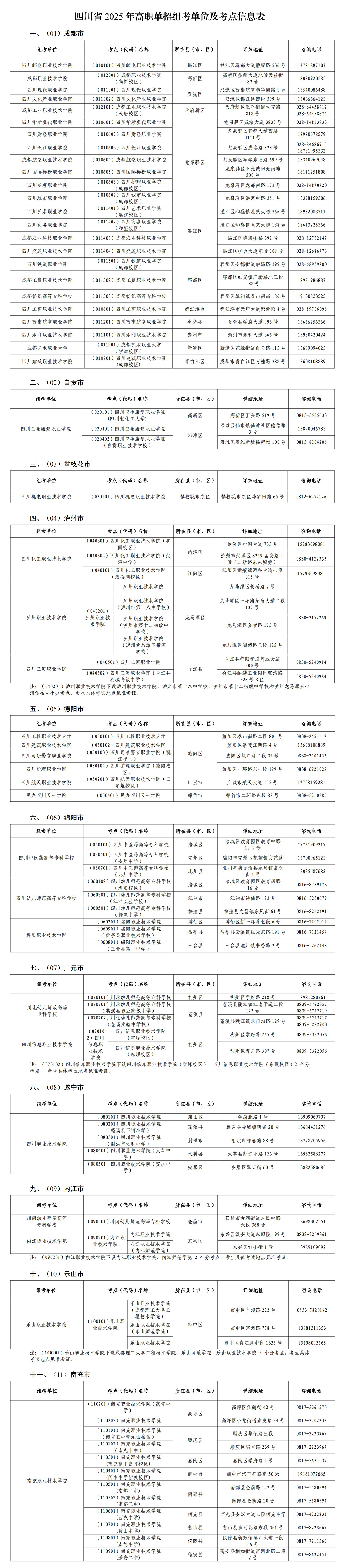 根据《四川省教育厅关于做好2025年高等职业教育单独考试招生有关工作的通知》文件要求,成都纺织高等专科学校等50所省内高等职业学校为我省2025年高等职业教育单独考试招生组考单位,巴中市、资阳市、阿坝州、甘孜州4个市(州)无组考单位,由市(州)考试招生机构代为组考。现将组考单位及考点信息予以公布。