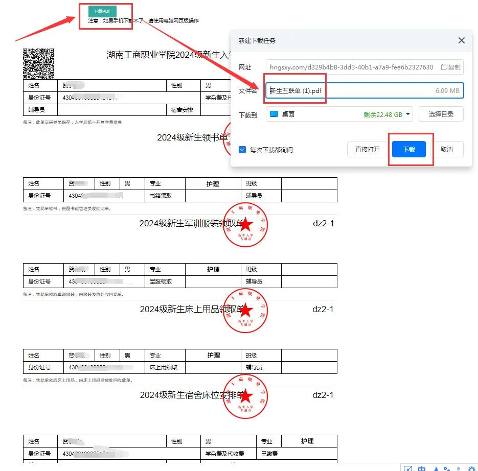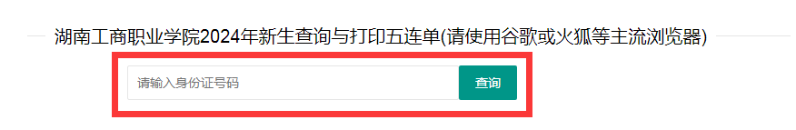 弹出“湖南工商职业学院2024年新生查询与打印五联单”页面,