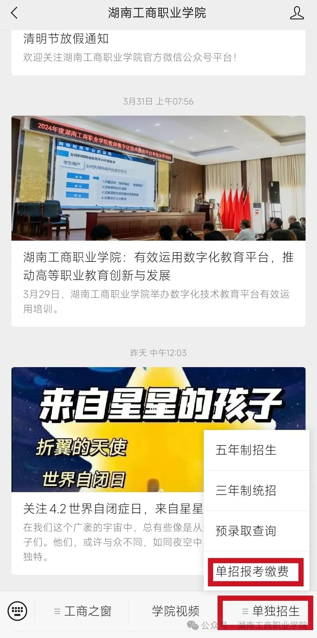 ②关注后进入以下页面,点击底部导航栏“单独招生”“单招报考缴费”。