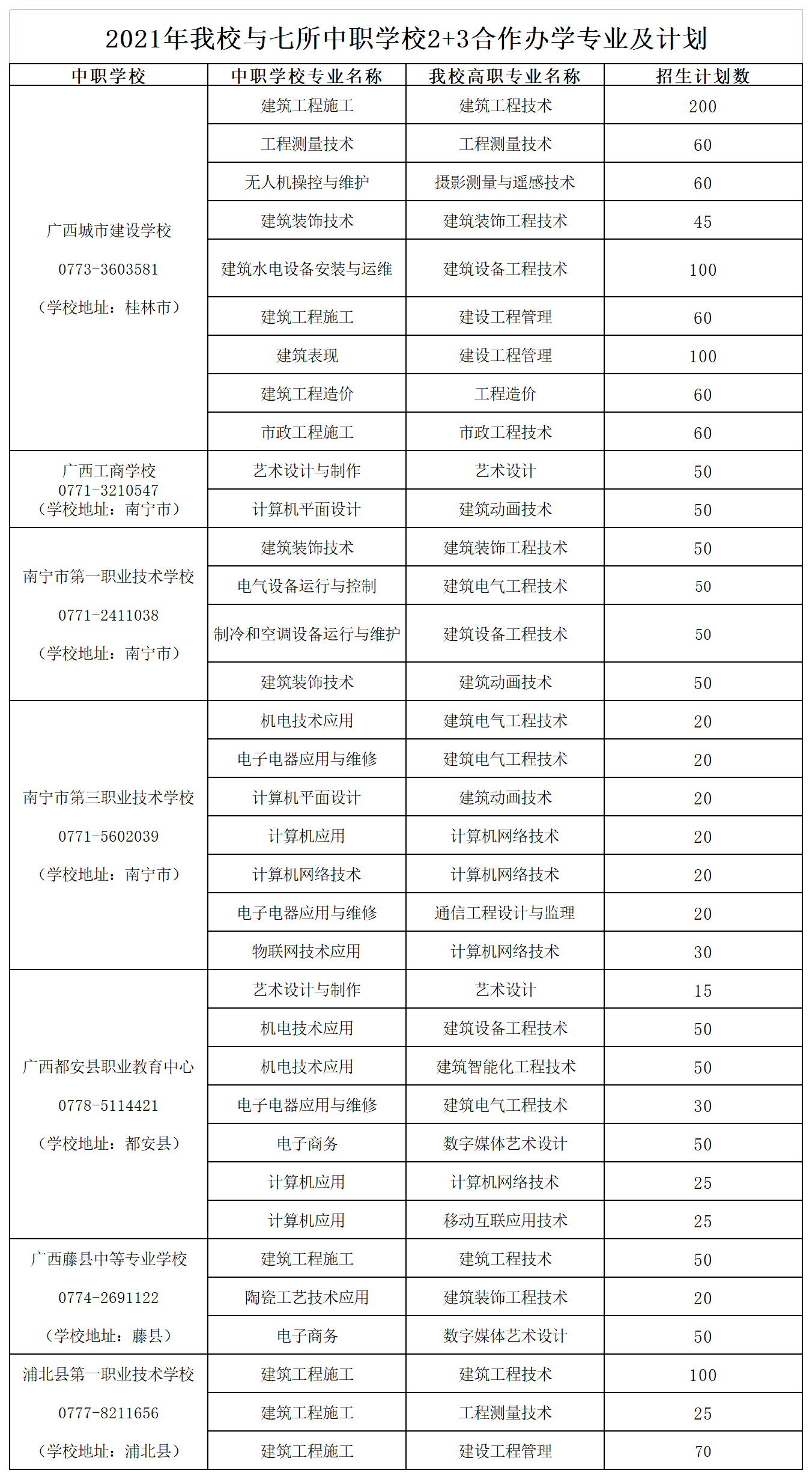 2021年我校与七所中职学校2+3合作办学专业及计划