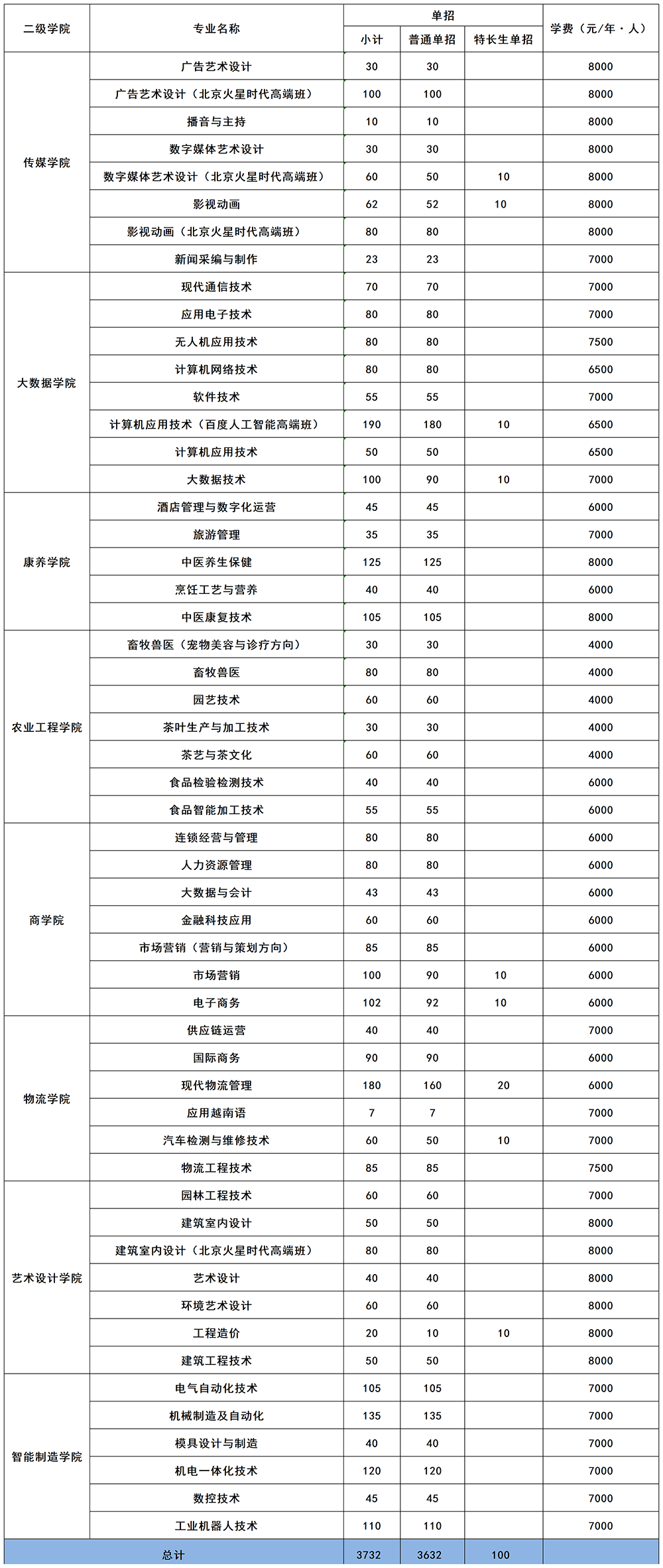 注: 1.2022年实际招生计划、收费标准以自治区教育厅公布为准。 2.北京火星时代高端班就读生在入学后需再向企业交纳4000元/年·人的企业培训费。 3.百度人工智能高端班就读生在入学后需再向企业交纳3800元/年·人的企业培训费。