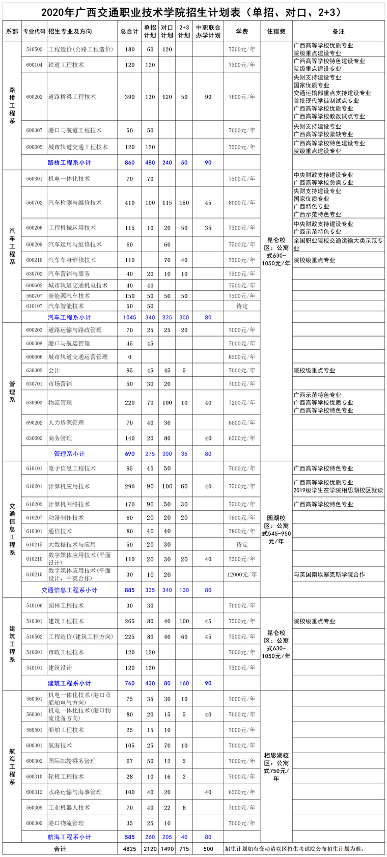 2020年广西交通职业技术学院招生计划表(单独对口)