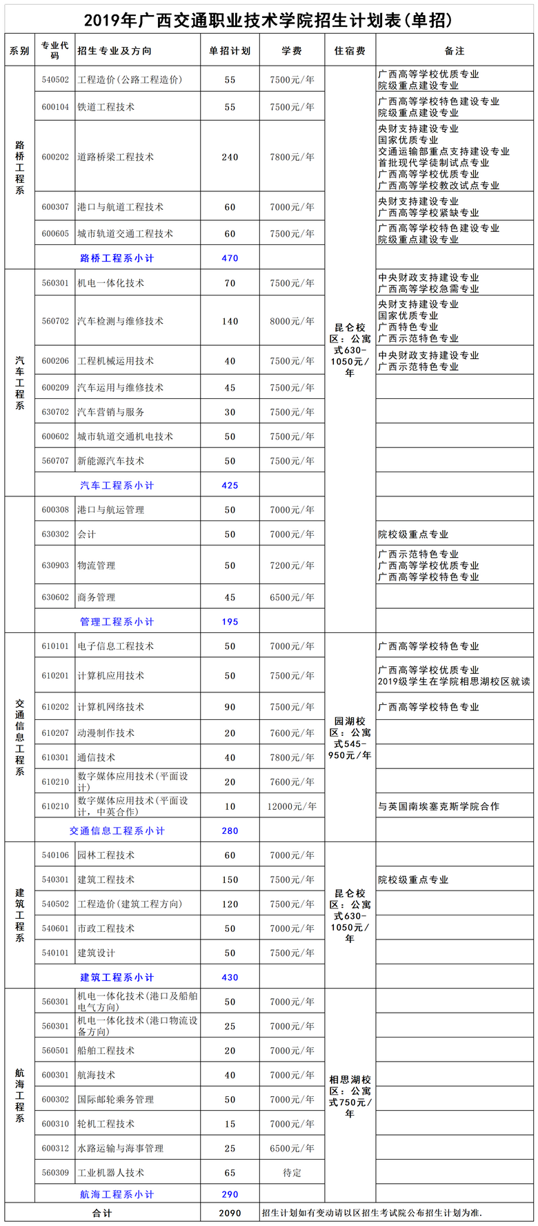 【招生计划】2019年广西交通职业技术学院招生计划(单招)