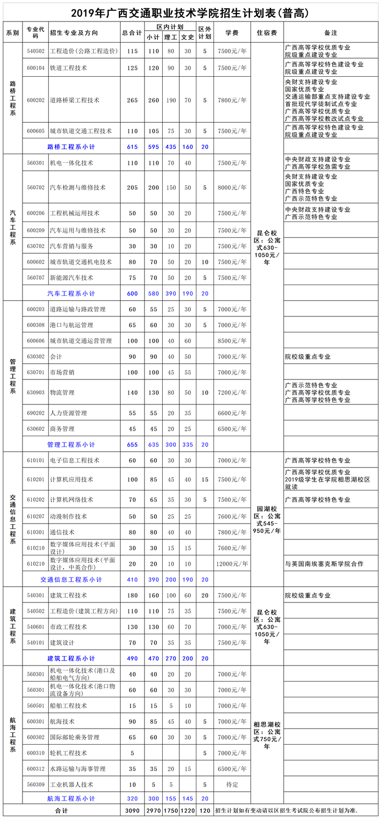 【招生计划】2019年广西交通职业技术学院招生计划(普高)
