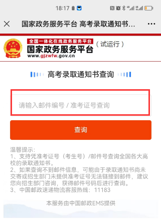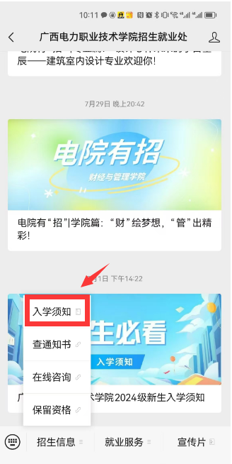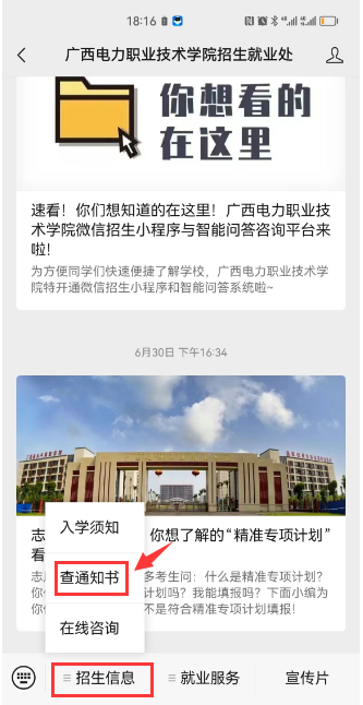 关注广西电力职业技术学院招生就业处微信公众号,从“招生信息”菜单栏的“查通知书”进入查询界面,输入准考证号或者考生号即可查询邮件信息。