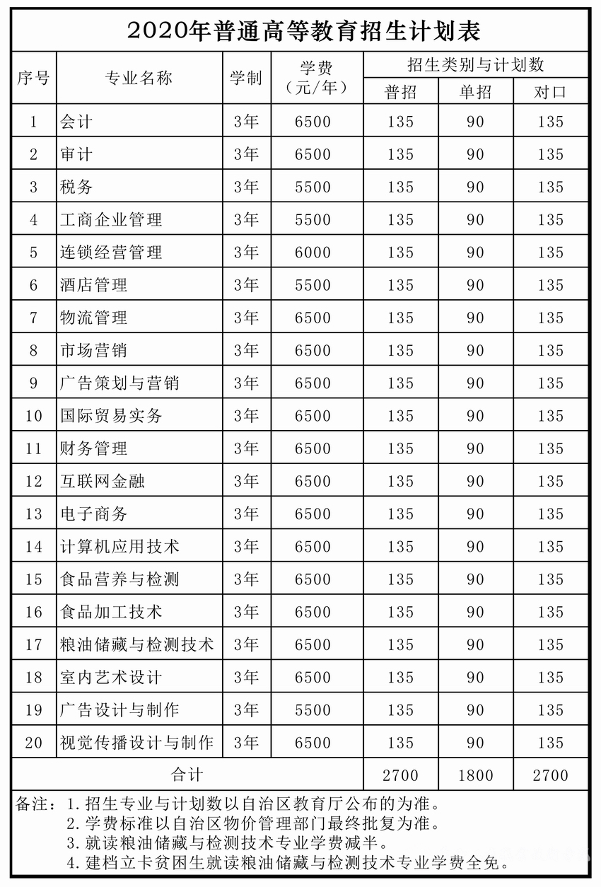 广西工商职业技术学院2020年普通高等教育招生计划表