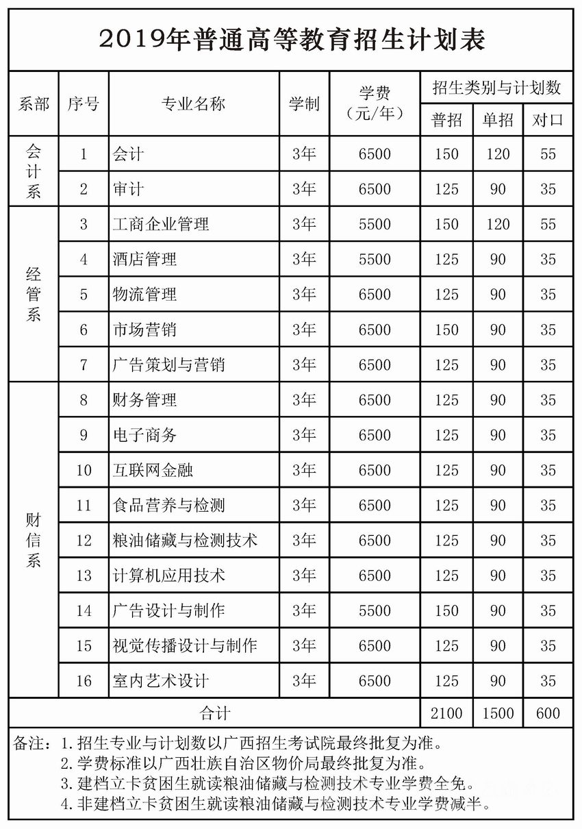 广西工商职业技术学院2019年普通高等教育招生计划表