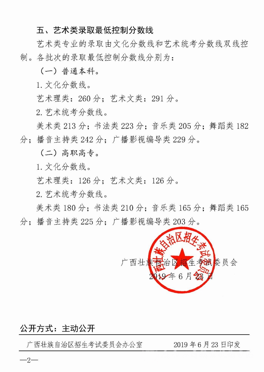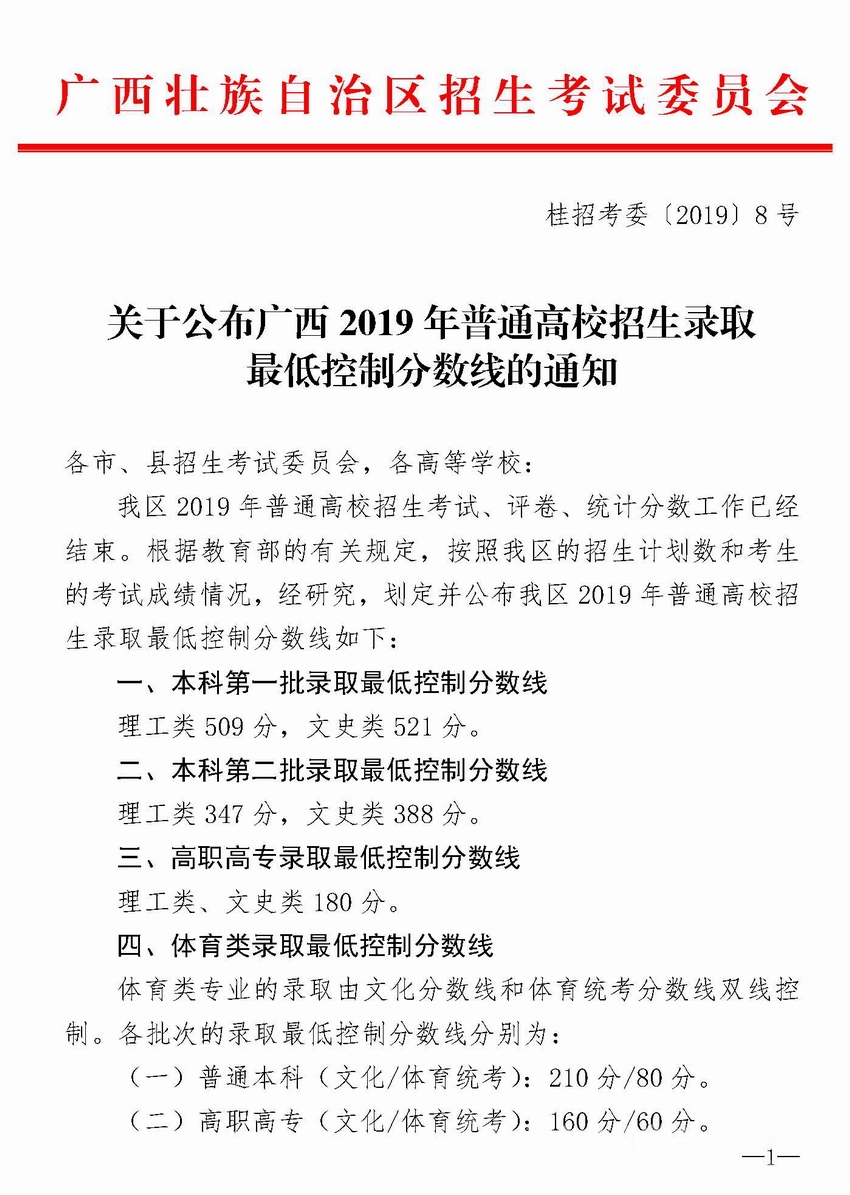 关于公布广西2019年普通高校招生录取最低控制分数线的通知