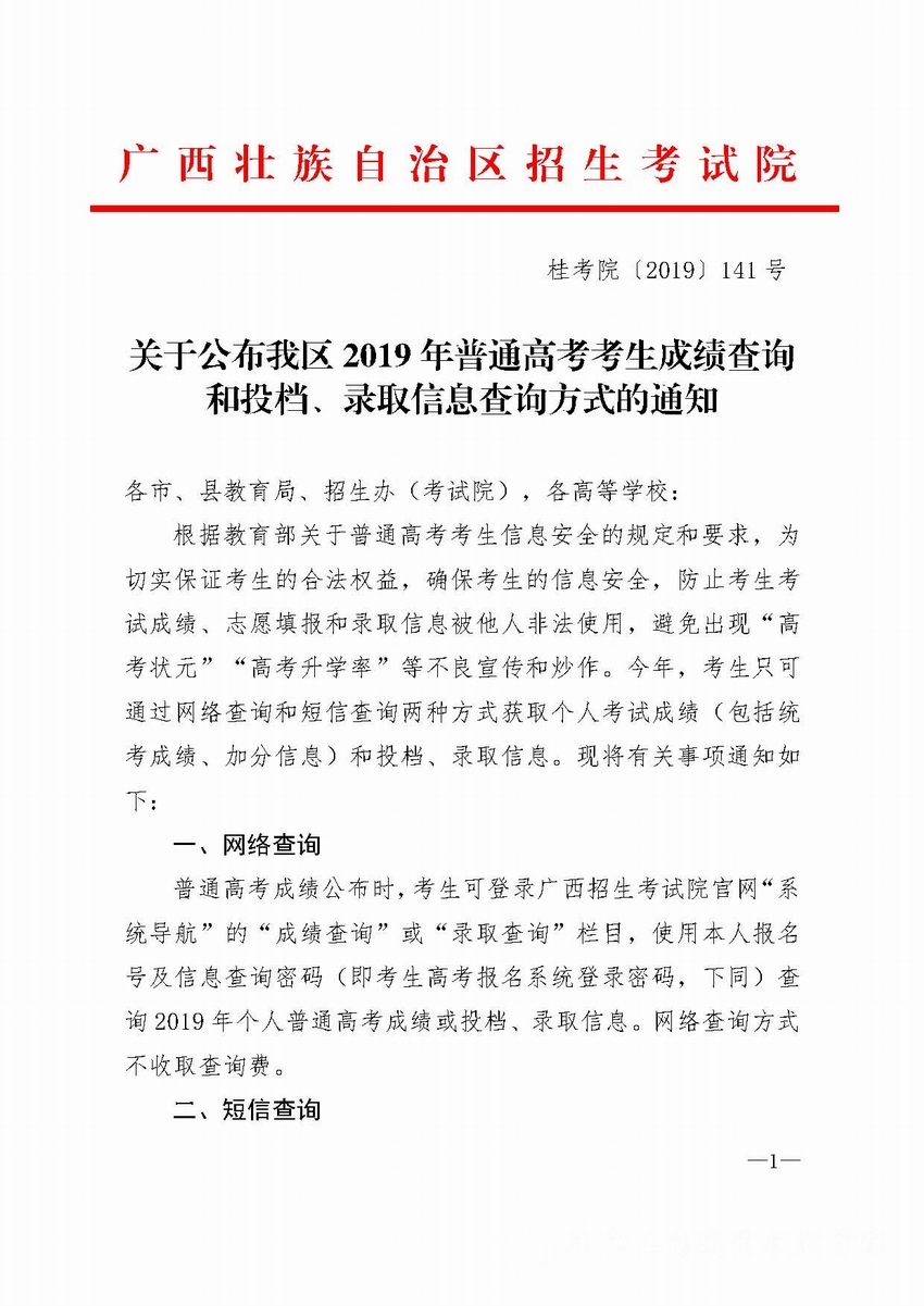关于公布我区2019年普通高考考生成绩查询和投档、录取结果查询方式的通知