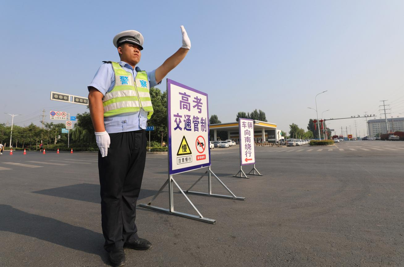 交警设置交通管制,为高考学子护航