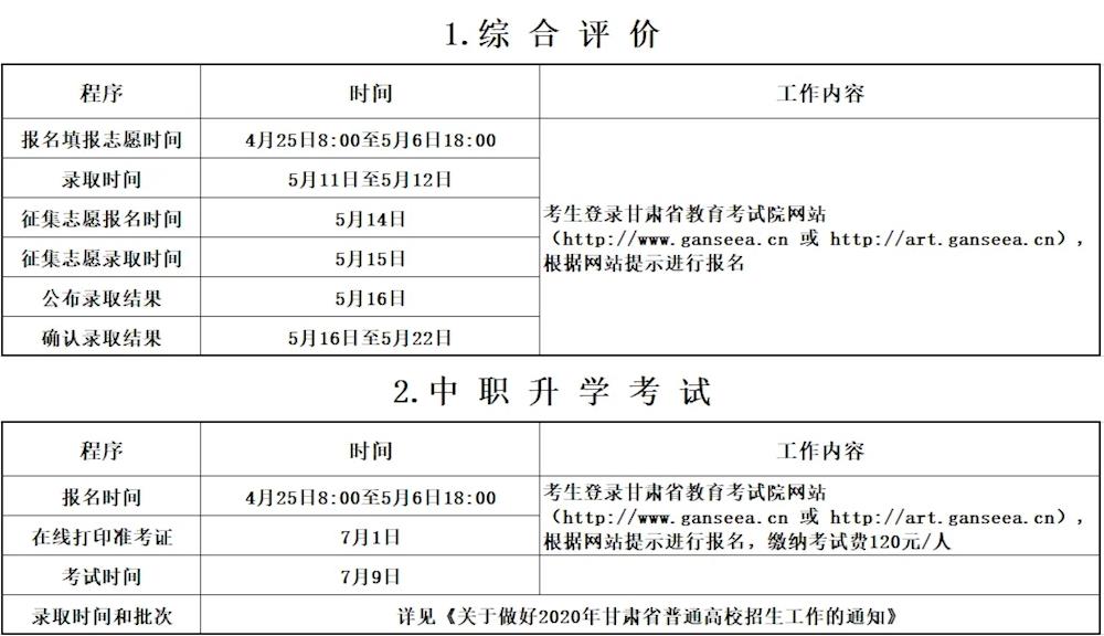 参加综合评价录取的考生第一次填报志愿在报名时即 4 月25 日-5 月 6 日同步填报,征集志愿 5 月 14 日填报。参加中职升学考试录取的考生志愿在普通高考填报志愿时填报甘肃畜牧工程职业技术学院。