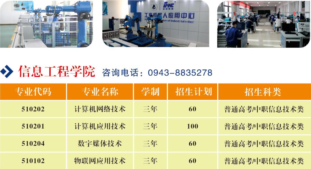 信息工程学院面向甘肃以及西部地区信息技术服务领域,坚持以学生发展为中心的教育理念,依托校企合作、校校合作,形成了健康、素质、技能的三位一体的培养模式,构建以网络技术为核心,计算机应用技术、物联网工程技术、数字媒体应用技术为基础的信息技术专业群,以“宽口径、大平台、重实践、多方向”为特色,致力于解决学生职业能力和市场对IT技术人才的需求,为甘肃经济建设与社会发展服务。现有全日制在校生900余人。现有专职教师35人,其中教授1人、副教授7人,硕士研究生5人,“双师型”教师10人。拥有物联网技术实训基地、华为网络实训、“1+X”Web前端、图形图像处理、新媒体处理等专业实训室12间。