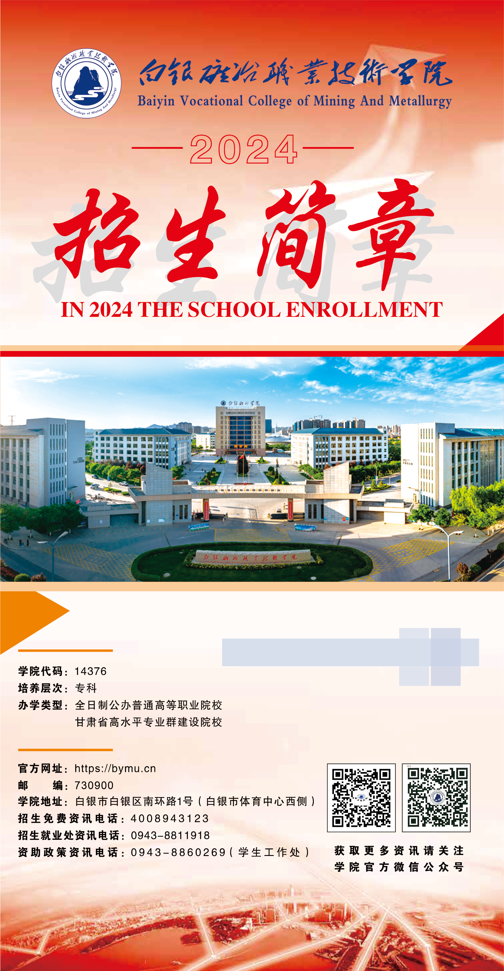 白银矿冶职业技术学院是经甘肃省人民政府批准、教育部备案的一所公办普通高等职业院校。学校地处白银市区,交通便利,距省会兰州仅40分钟车程;校园环境优美,人文气息浓厚,区位优势明显。学校分为南北两个校区,占地面积830余亩,建筑面积32万平方米,在校生规模10000余名。2021年学校被列为甘肃省“双高计划”高水平专业群建设单位,综合实力位居全国有色金属行业高职院校前列。与东北大学开展全面战略合作,重点扶持我校有色冶金专业,助力我校高水平专业群建设。与西北师范大学、天津职业技术师范大学就师资培训、学生培养等方面开展校校合作。学校紧跟市场需求,专业设置门类齐全、特色鲜明,现有35个招生专业。