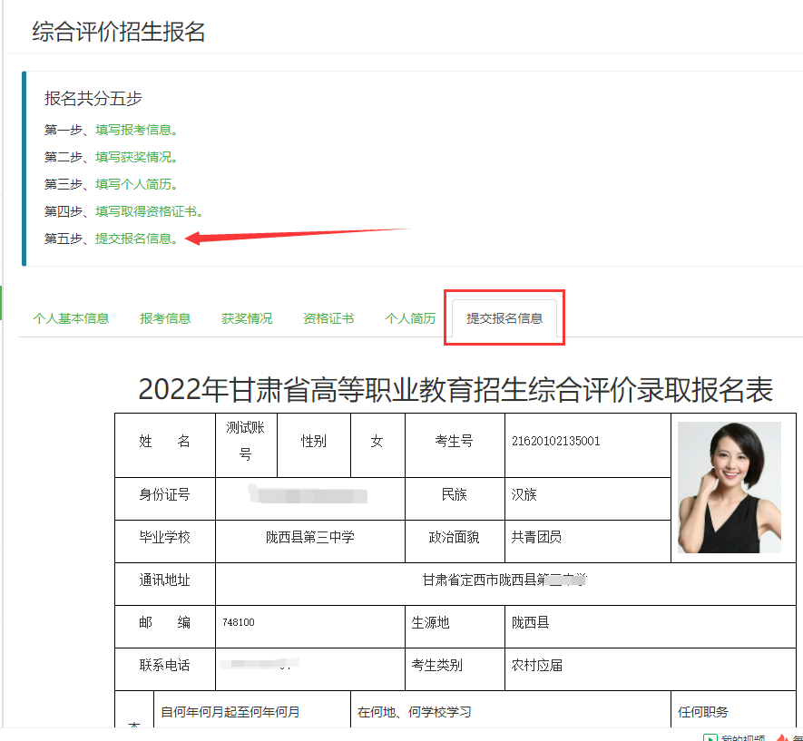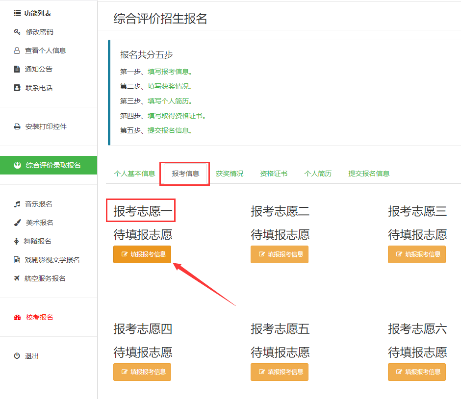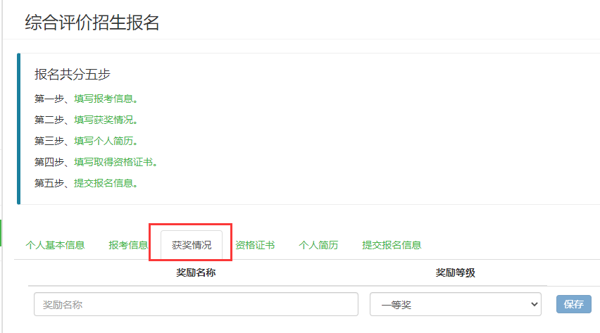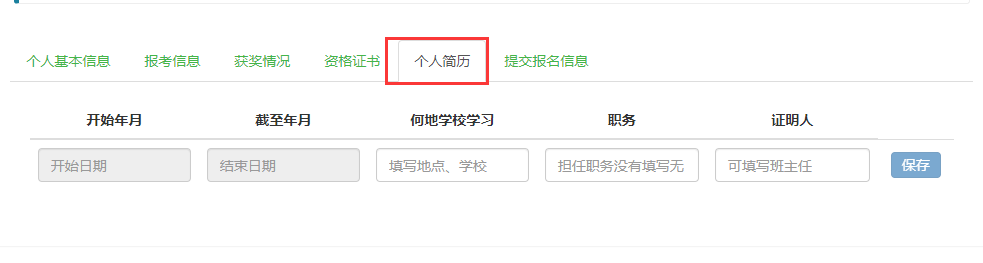 考生完成志愿填报后,继续完成“获奖情况”“资格证书”“个人简历”的信息填报。