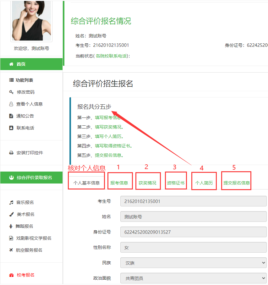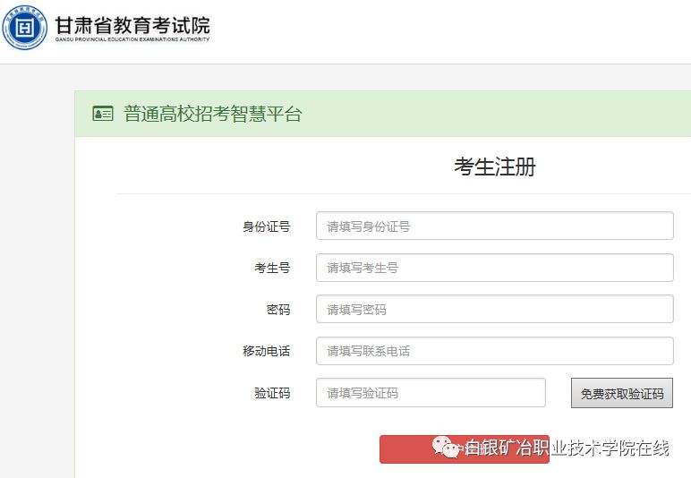 3.填写身份证号码、考生号、密码、移动电话、验证码,完成用户注册。