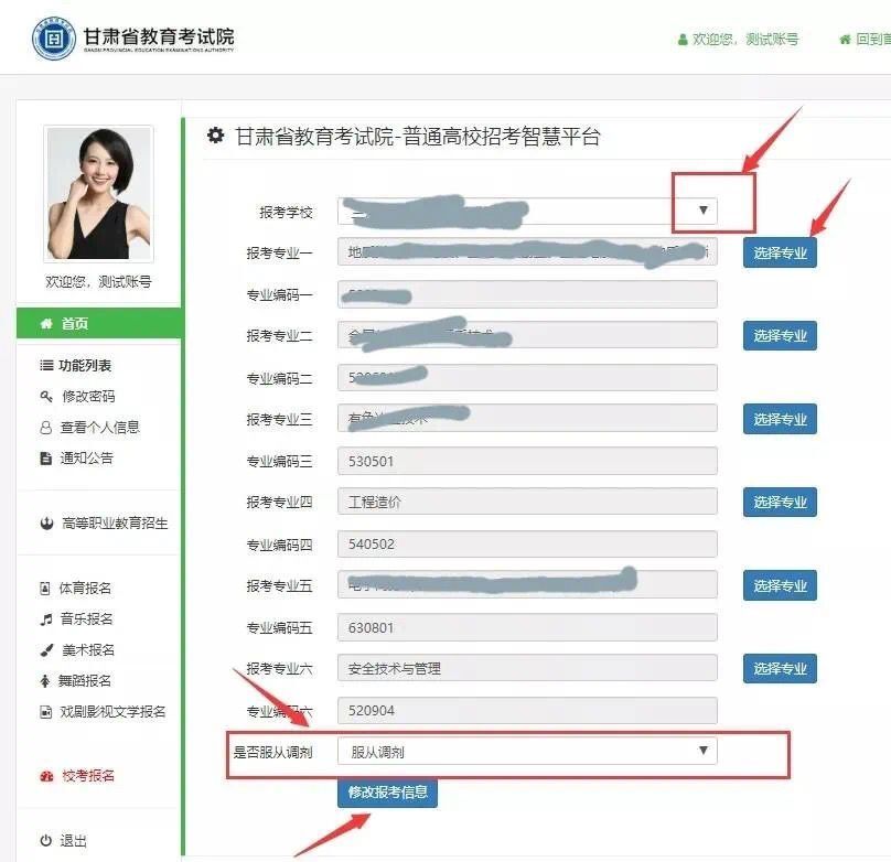 5. 填报志愿:点击“填报报考信息”,进入选择院校、专业界面,考生可填报9个志愿院校,每个院校志愿设置6个专业选项和1个专业调剂选项。有意向报考我院的考生建议第一志愿选择“甘肃农业职业技术学院”,并建议勾选“服从调剂”选项。