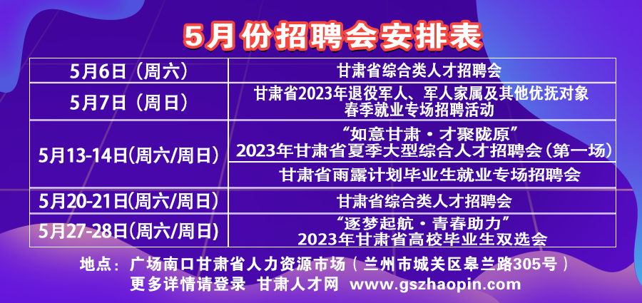 一、活动名称甘肃省2023年雨露计划毕业生专场招聘活动暨夏季综合人才招聘会二、举办单位(一)主办单位:甘肃省乡村振兴局、甘肃省教育厅、甘肃省人力资源和社会保障厅(二)承办单位:甘肃省人力资源市场、甘肃省高校毕业生就业办公室(三)协办单位:各市州乡村振兴局、教育局、人社局三、服务对象(一)有用工需求的各类企事业单位。设置乡村就业工厂(帮扶车间)招聘专区。(二)甘肃省中职、高职院校和技工类院校雨露计划2023届毕业生、离校未就业毕业生,省外就读的甘肃籍雨露计划2023届毕业生、离校未就业毕业生。四、活动形式 本次专场招聘活动采取“现场招聘+线上招聘+直播带岗”相结合的形式举办。现场招聘活动在甘肃省人力资源市场2楼招聘大厅设立招聘展位,活动当天拟邀请省乡村振兴局、省教育厅、省人力资源和社会保障厅等有关单位领导出席;邀请有招聘雨露计划毕业生的各类用人单位参会,统一发布招聘需求,现场与求职者洽谈对接;直播带岗活动将邀请省乡村振兴局负责同志、部分用人单位和就业指导专家做客直播间,开展相关政策解读、毕业生推荐、岗位需求推介、职业指导等活动;线上招聘在甘肃人才网开设专区,面向全国征集有招聘需求的用人单位就业岗位信息,并统一发布,收集求职简历。(一)现场招聘会时间:2023年5月13日-14(周六、周日) 9:00-13:00地点:省人力资源市场2楼招聘大厅(二)直播带岗时间:2023年5月13日(周六) 9:00-13:00直播平台:甘肃省人力资源和社会保障厅官方抖音号、甘肃省人力资源市场官方抖音号及微信视频号、甘肃人才网(三)网络招聘时间:2023年5月13日-6月13日支持平台:甘肃人才网www.gszhaopin.com五、参会方法(一)现场招聘1.用人单位。有招聘需求的各类企事业单位登录甘肃人才网(www.gszhaopin.com)点击“现场招聘会”进入“甘肃省2022年雨露计划毕业生专场招聘活动暨夏季综合人才招聘会”→点击“企业参会”或“在线预订”,登录企业后台(无账号点击注册,账号认证通过后再报名)→发布招聘职位→提交审核→审核通过后开始接收简历、预约面试。2.求职个人。各类求职者于招聘会当天上午8:30-13:00之间前往省人力资源市场2楼招聘大厅,面对面与用人单位进行洽谈交流,投递简历。(二)网络招聘1.用人单位。有招聘需求的各类企事业单位登录甘肃人才网(www.gszhaopin.com)点击“甘肃省2023年雨露计划毕业生专场招聘活动暨夏季综合人才招聘会”通栏广告图标→点击“企业参会”或“我要报名”,登录企业后台(无账号点击注册,账号认证通过后再报名)→发布招聘职位→提交审核→审核通过后开始接收简历、预约面试。2.求职个人。方法1:求职个人通过PC端或手机端登录“甘肃人才网”(www.gszhaopin.com),点击菜单栏“招聘会”→“网络招聘会”,点击“甘肃省2023年雨露计划毕业生专场招聘活动暨夏季综合人才招聘会”→点击“进入展会大厅”,查询职位信息,投递简历,参会求职。方法2:手机微信小程序搜索“甘肃省人力资源市场微招聘”或扫描下方二维码,点击“网络招聘会”→选择点击“甘肃省2023年雨露计划毕业生专场招聘活动暨夏季综合人才招聘会”“→点击“进入展会大厅”,查询职位信息,投递简历,参会求职。