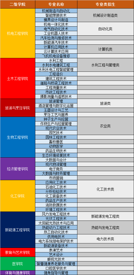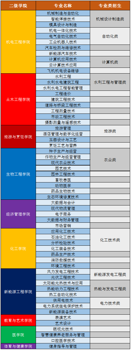 学校以产业为内驱,以市场为导向,瞄准酒泉以风光资源为依托的新能源产业,以大禹节水为龙头的水利行业智能灌溉产业,以敦煌莫高窟和酒泉卫星发射中心为品牌的文化旅游产业,以节水高效特色农业为支撑的“一特四化”现代农业,以及西北地区基础雄厚、发展迅猛的化工产业等地方支柱产业,专业结构逐年优化,专业内涵逐步提升,实现了专业与产业高位对接。现开设高职专业71个,应用型本科专业4个(兰州理工大学和河西学院设置),拥有中国特色高水平专业群1个、示范(骨干)专业4个、首批现代学徒制试点专业4个、全国职业院校残疾人康复人才培养改革试点专业1个、甘肃省高等学校特色专业4个、创新创业改革试点专业1个、省级职业教育骨干专业7个、入列省级优质高职项目9个专业(群),形成了特色鲜明、优势明显的专业集群。