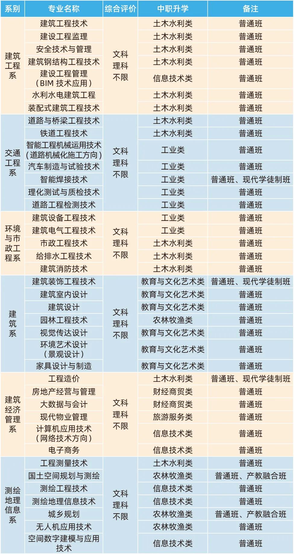 学院共有土木建筑、交通运输、资源环境与安全、水利、装备制造、电子与信息、财经商贸、轻工纺织、文化艺术9大类22个专业类42个专业,其中,国家级骨干专业5个,省级骨干专业6个,特色专业7个,省级示范院校重点专业5个,省优质校重点建设专业(群)8个,省级“双高”专业群1个。学院以产业聚焦、突出特色、错位发展、梯度建设为原则,构建了以建筑工程技术专业群、智能测绘与空间规划专业群为优势专业群,以安装工程技术专业群、环境艺术设计专业群为骨干专业群,以其他相关专业组群为培育专业群的“新型城镇空间”规划建设与服务一体两翼专业集群。