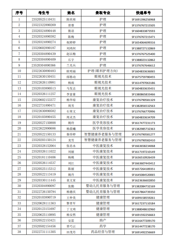 根据学院工作安排,我院2023级高职录取通知书已于2023年8月18日由顺丰快递全部发放完毕。但由于部分新生预留联系方式有误,导致顺丰快递无法正常派送,请以下名单里的新生尽快根据自己的快递单号查询投递状态或致电招生办公室电话0854-5415555咨询(截至9月8日)。