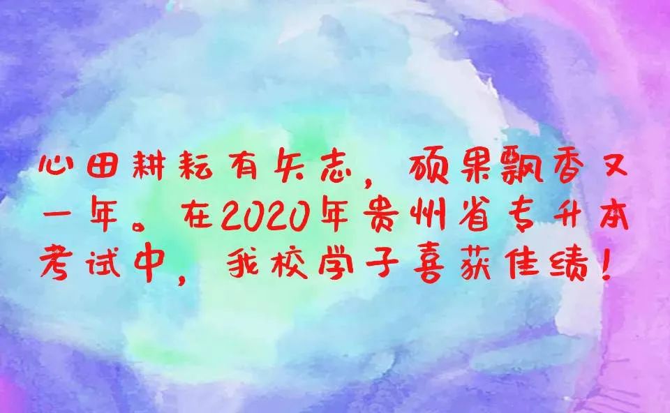 刘垚,李涛,卞晓珺等382名学生分别被贵州大学、贵州师范大学、贵州财经大学、贵州民族大学、贵州师范学院、贵州理工学院、贵阳学院、铜仁学院、安顺学院、遵义师范学院、凯里学院、六盘水师范学院、贵州工程应用技术学院、黔南民族师范学院、兴义民族师范学院、贵州商学院等24所本科高校录取,其中符合免试资格升入地区本科院校的11人,录取率达53.7%。成绩的取得是学校全体师生努力拼搏的结果,也是学校人才培养结出的硕果,充分展现了我校教师良好的教学水平、学生良好的综合素质和超强的学习能力,是学校近年来重视教学管理、提高教学质量的最好回报,更是学校不断加强内涵建设的成果体现。在表示祝贺的同时,希望同学们能够在新的平台不断求索、脚踏实地、力争上游,在本科院校继续朝着自己的理想而努力奋斗,也希望其他同学以学长学姐们为榜样,不甘平庸、追求卓越。