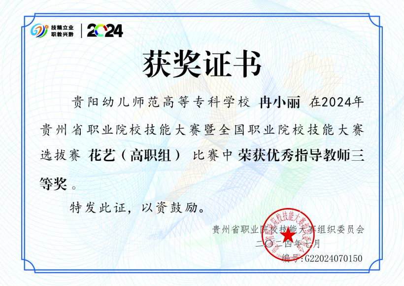 2024年5月我系学生陈雨宏(指导教师罗云南)获得2024年贵州省职业院校技能大赛(高职组社区服务实务赛项)一等奖