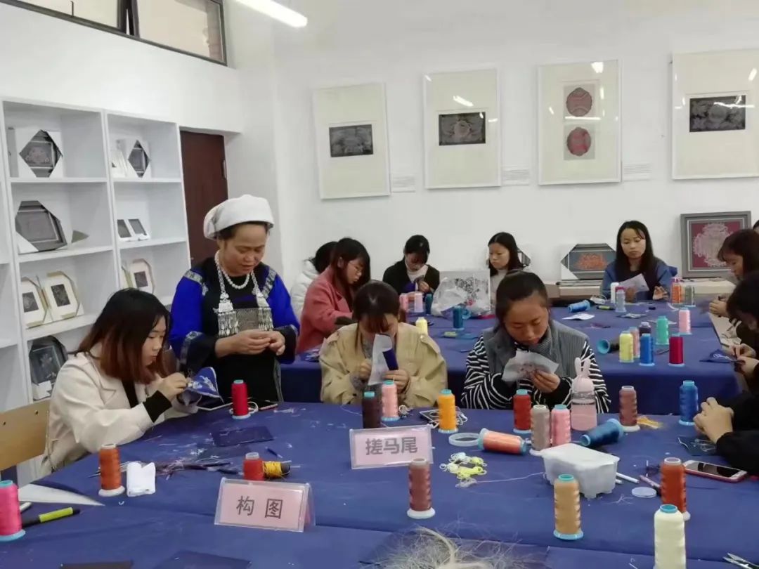 马尾绣国家级非遗大师宋水仙进校园进行技法课程。