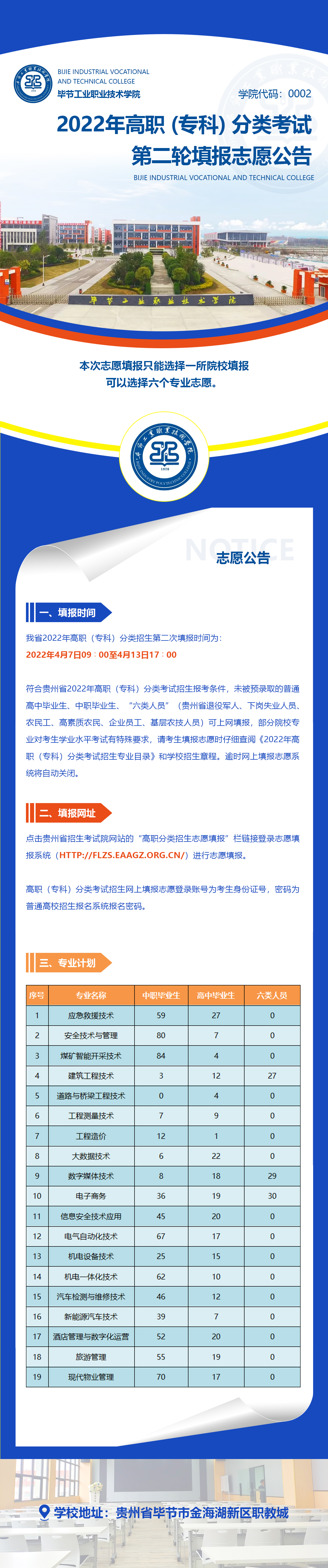 毕节工业职业技术学院2022年高职(专科)分类考试第二轮填报志愿公告