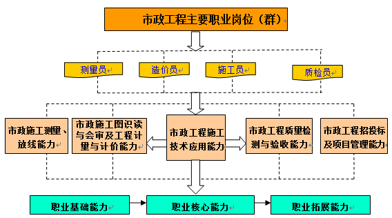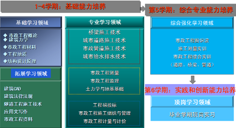 市政工程技术专业的课程设置以工作过程作为导向,以工作任务为依托,遵循职业能力形成规律:形成基础性学习领域→单项职业能力学习领域→综合职业能力学习领域→职业素质与能力拓展学习领域的课程体系,在强化实训和突出职业能力方面,按照课程实训→岗位实训→能力拓展→综合实训→顶岗实习的模式,全面提高学生职业素质及职业能力。