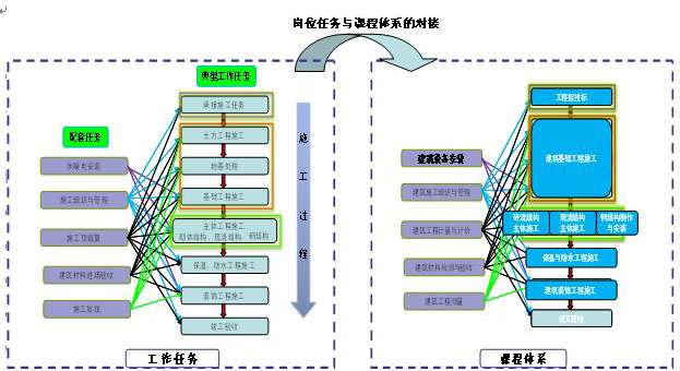 整个过程贯穿岗位关键职业能力的培养主线,构建以工作过程为导向的“理实一体”的课程体系。在课程内容上,按照施工技术和施工管理两大方面,开发“工学交替、项目导向、任务驱动”等教学模式的核心课程,进行核心课程的建设,全面推进现代化教育手段的应用,树立先进的高职教育观念,探索教学方法,逐步推行项目教学模式及理实一体的教学模式。逐步形成知识和能力双考核体系。按照岗位的职业技能标准,聘请现场工程技术人员参与对学生的考核和评价,使理论与实践相融合,职业道德教育与专业教育相渗透。健全教学管理制度,保障教学质量和监控体系运行良好。