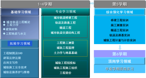 专业课:城市轨道工程概论、工程制图及CAD、建筑材料、轨道及路基工程、工程力学、工程地质与水文、工程施工测量、隧道工程、土力学与地基基础、城市轨道桥梁工程、城市轨道交通结构工程、工程造价、城轨工程施工组织;