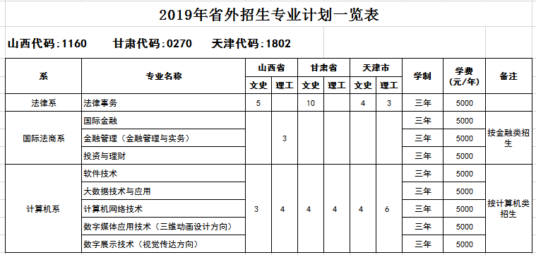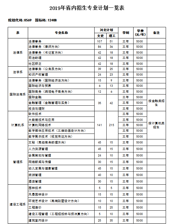 河北政法职业学院2019年普招招生计划一览表