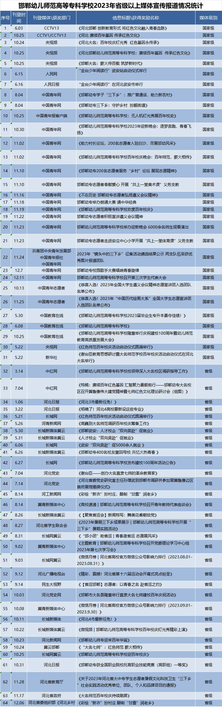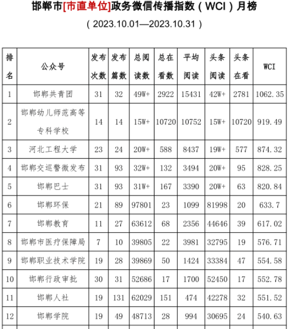 学校官方微信公众号影响力实现“爆发式”增长。全年发文228篇,持续进入河北省教育厅高校月排行榜、邯郸市市直单位排行榜前茅,其中,河北省高校官方微信公众号月度影响力排行榜TOP50中,10月份排名第3,热文排行榜TOP50中,10月份上榜5篇;邯郸市政务新媒体微信公众号排行榜,10月份排名第2。公众号关注人数从年初5418人上升到13204人,增长率144%。
