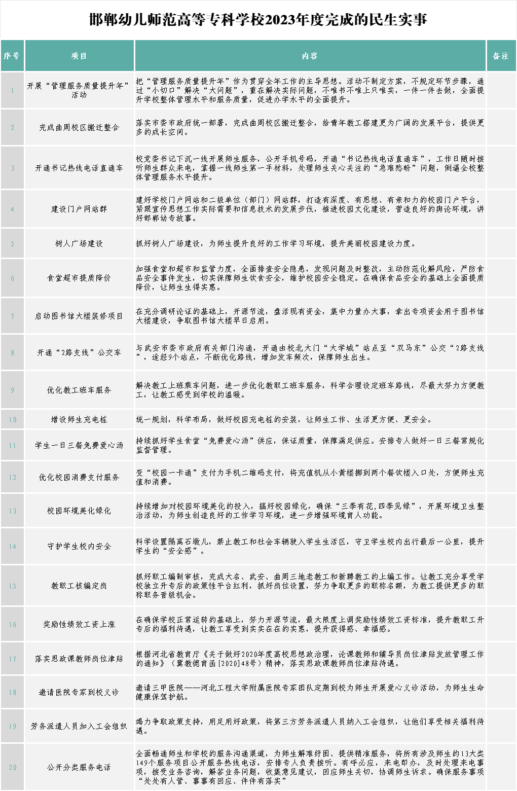 开展管理服务质量提升年活动,开展“最多跑一趟”活动,开展“促学风、强教风、树校风”专项整治行动,持续提升党员干部管理与服务水平。着力走好网上群众路线,构建覆盖全校各单位(部门)的网评员队伍,建立微博超话半小时回复制,强化党委书记热线、校长信箱、13类149项分类服务直通热线接诉即办机制,方便师生诉求解决。与武安市委市政府密切沟通,主校区大门外侧道路整修、路灯运行,支2线公交车成功营运,极大方便了师生出行。污水管网接入武安市政管网,每年节约资金240万元。千方百计筹集资金1300余万元,对近1万平米的图书馆进行内部装修,将于2024年春季学期投入使用。安装260盏LED节能灯、130个节能阀,设置12盏照明大灯,校园路灯亮化得到整体提升。增设100余个分类垃圾桶,安装70个校内充电桩,设置隔离墩、减速带,实现生活区与教学区有机隔离。引入高质量医疗资源,医务室医生24小时在位值班,增加日常用药80余种,满足师生日常基本检查和购药需求。联系社会各界纷纷捐款捐物,教学楼、报告厅、操场等场所加装大屏。积极推进“一站式”学生社区综合管理模式建设,高标准建成“一站式”学生服务中心,打通思想政治工作“最后一公里”。建设校内自主打印复印服务中心,直饮水、热水、洗浴、吹风机普遍降价。大力开展资助育人,打造“奖、贷、助、补、减、免、勤”七位一体工作模式。学校领导班子成员带队分赴省内各地市开展“暑期大家访”活动,调研慰问家庭经济困难学生、学业困难学生300余名;国家助学金资助2401人次,发放助学金374.875万元。针对省内外多地遭受暴雨洪涝灾害,学校实施受灾学生临时困难专项补助,为62名因灾害造成家庭经济临时困难的学生发放临时生活补助6.2万元,为排查出的17名困难学生发放助学金2.805万元,为42名家庭困难毕业生申请求职补贴8.4万元。2023年初确定的20件民生实事全部落实到位。
