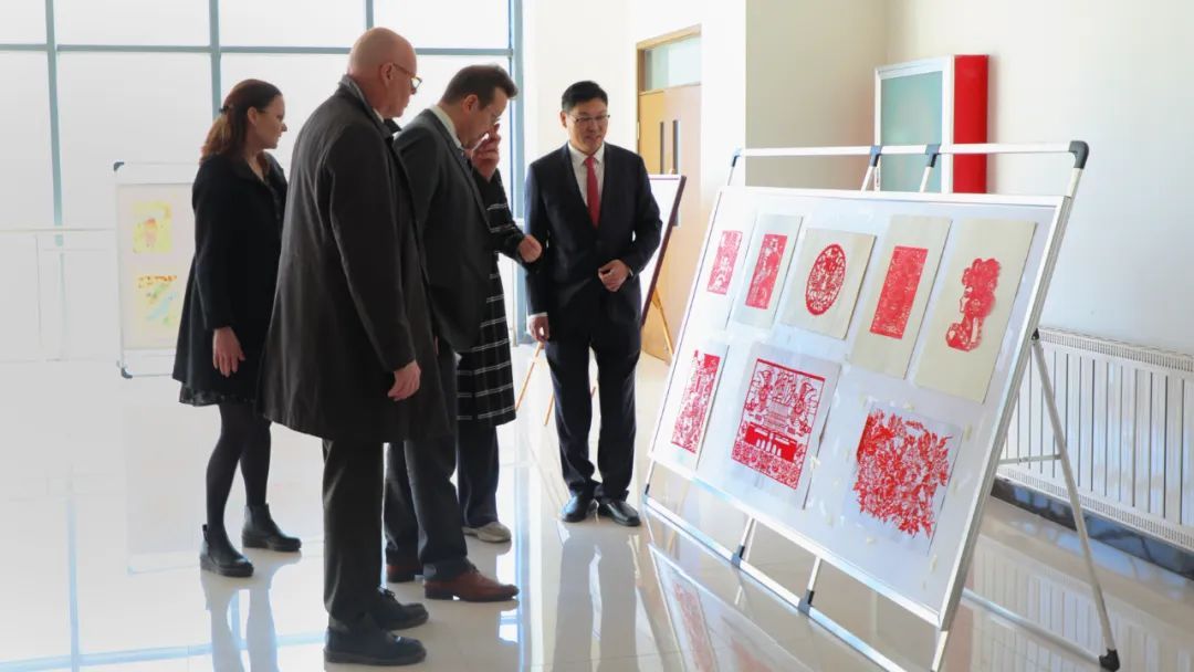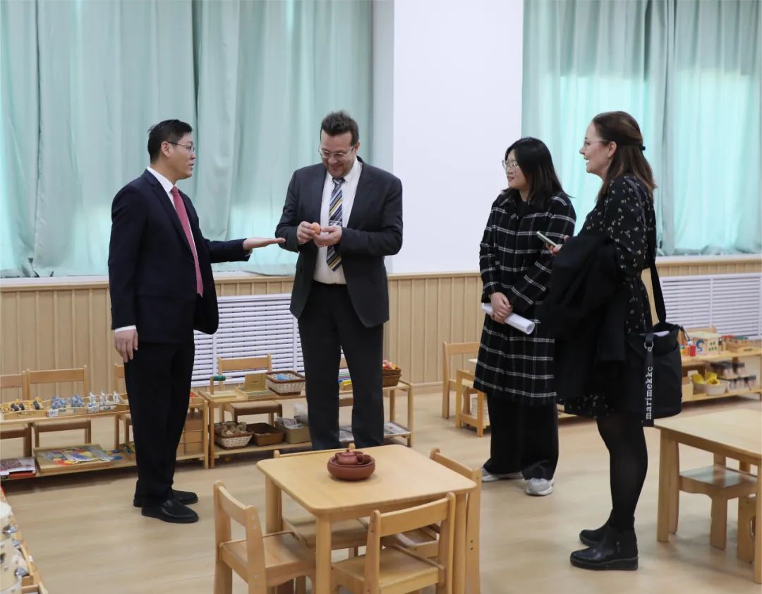 维萨·乔特森一行参观了我校学前教育系举办的“学习贯彻习近平新时代中国特色社会主义思想主题教育教学成果”师生书画展,在学前教育系二楼舞蹈教室欣赏了柯乃钰老师教授的维吾尔族舞蹈,在学前教育实训室参观了学前智慧实训室、仿真育婴实训室、蒙台梭利教法实训室、亲子活动室、感统实训室、科学探究室、玩教具制作实训室、百艺工坊、木工坊、营养配餐室等。