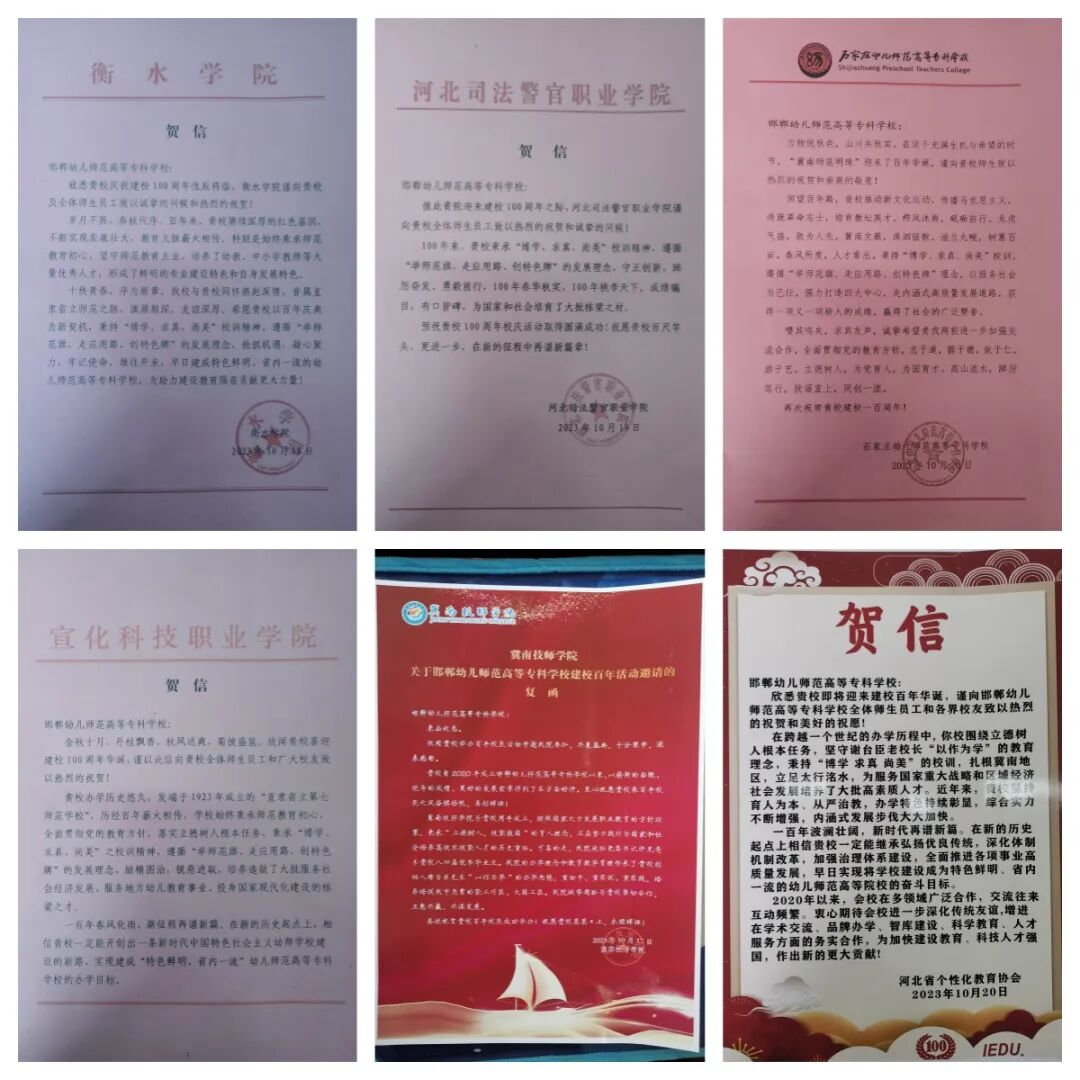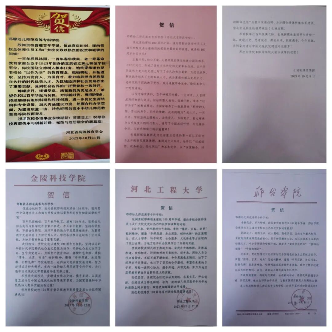 长城新媒体集团、金陵科技学院、河北工程大学、邢台学院、衡水学院、河北司法警官职业学院、石家庄幼儿师范高等专科学校、宣化科技职业学院、冀南技师学院、河北省个性化教育学会等友好单位、兄弟院校发来贺信,为学校百年华诞送来祝福。